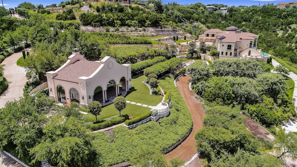 Welcome to "Villa Del Lago," a uniquely magnificent estate nestled on over 20 hillside acres of prime south shore lakefront property, offering breathtaking, unobstructed views of Lake Travis. This prestigious residence, with its dramatic pavilion, meticulously designed lawns, gardens, and striking grotto, is a haven of elegance and natural beauty. The main house, spanning nearly 15,400 square feet, features 6 bedrooms, 13 baths, and captivating lake views from almost every room. Immerse yourself in luxury with 5 fireplaces, a media room, home theater, library, wine cellar, and massage room. The gourmet chef's kitchen is a culinary masterpiece, equipped with Viking appliances, triple ovens, a built-in fridge, and a coffee machine. An extensive entertainment bar, game room, and sitting area provide ample space for relaxation and enjoyment.