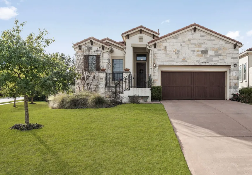 Exquisite one-story Tuscan-style residence situated on a premium corner lot on a quiet cul-de-sac street within the gated Flintrock Falls golf community in the heart of the Texas Hill Country. This beautiful lock-and-leave home harmonizes quality craftsmanship with luxurious finish outs, offering a low-maintenance lifestyle that embodies modern elegance. Interior features include high 12-foot ceilings, hardwood flooring, granite counters throughout, crown molding, a vast array of windows allowing an abundance of natural light, new paint and new carpet in all bedrooms (2024). The Chef's kitchen showcases stainless steel appliances (new refrigerator and dishwasher 2024), a large center island, tons of counter space and storage, gas cooking and a generous walk-in pantry. The open-concept living space boasts a wall-to-ceiling stone fireplace along with direct access to a screened-in back patio, creating an ideal atmosphere for gatherings. The spacious primary retreat includes separate vanities, an oversized soaking tub, a glass shower along with a huge walk-in closet. Enjoy incredible views of the hill country from your own front door or relax in the gated backyard. Flintrock residents enjoy 24/7 gated access and privacy along with social privileges at The Hills Country Club including access to four restaurants, two swimming pools and a state-of-the-art fitness center. Upgrade options are available for tennis, pickleball and access to four championship golf courses at The Hills, Flintrock, Yaupon and Live Oak. Some photos have been edited.