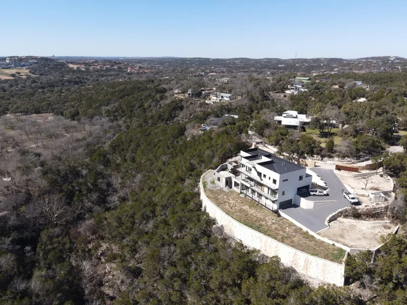 Walls of Pella glass frame sweeping Hill Country views, while 14-foot ceilings enhance the openness of each space. A 10-foot entry door leads into an interior defined by warm walnut and white oak cabinetry, a stunning Wolf/Sub-Zero kitchen, and a fully equipped prep kitchen designed for effortless entertaining. The primary suite on the main level is a retreat of its own, featuring a gas fireplace and spa-like bath with a dry sauna, salt wall, red light therapy, steam shower, and heated floors. Upstairs, a kitchenette and lounge open to a private terrace, while the lower level offers a wet bar, office, and a climate-controlled vault/safe room.