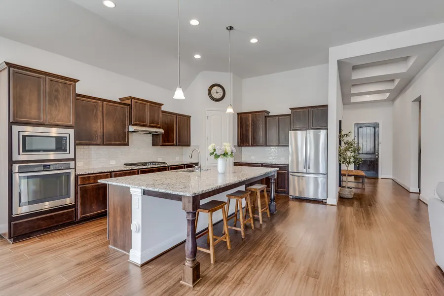 Welcome to this stunning single-story home with 4 bedrooms & 3 full bathrooms located on a quiet street in The Commons at Rowe Lane. This light-filled home features 12 ft. ceilings in living areas, 10 ft ceilings in bedrooms, 8 ft. doors & a clean and modern look & feel. The bright and airy kitchen has striking granite counters, an oversized island, ample cabinet space, stainless steel appliances, and a gas cooktop. The open floor plan is perfect for entertaining and family gatherings around the fireplace. The spacious primary suite features an elevated tray ceiling and fan, which leads into a large bathroom retreat complete with separate shower (dual shower heads) and garden tub, and huge walk-in closet. The covered back patio looks out into the well-maintained private backyard. Water softener/filter is included. The community includes a big greenbelt space, amenity center with volleyba...