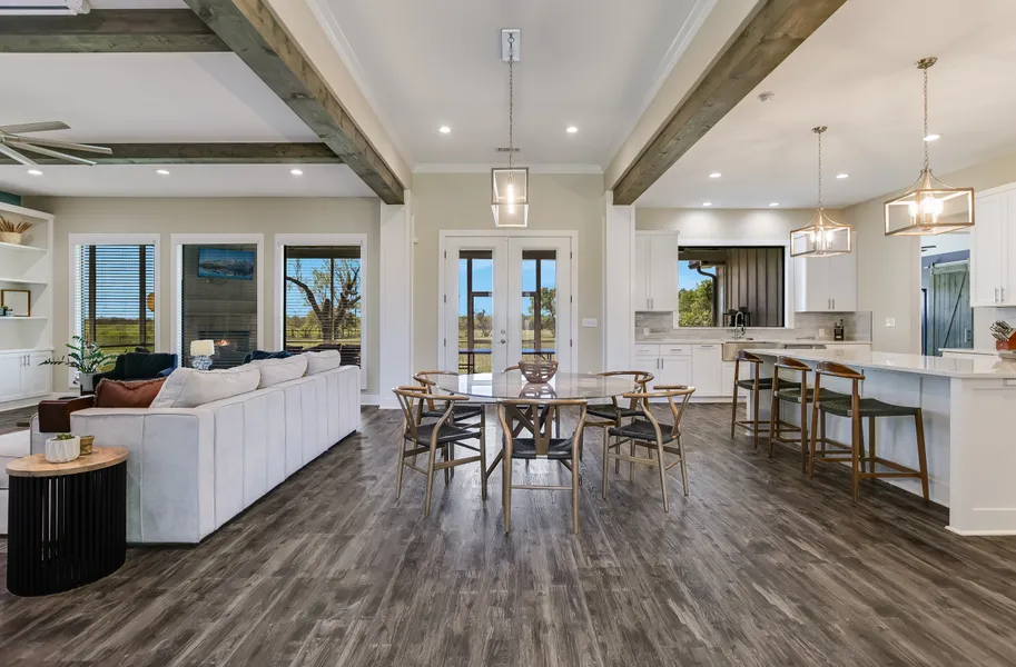 A thoughtfully designed single-story farmhouse with timeless character and modern comforts, this home balances elegant living with relaxed rural charm. Wide porches, abundant natural light, and clean architectural lines create an inviting backdrop for everything from quiet mornings with coffee to lively gatherings under big Texas skies.
