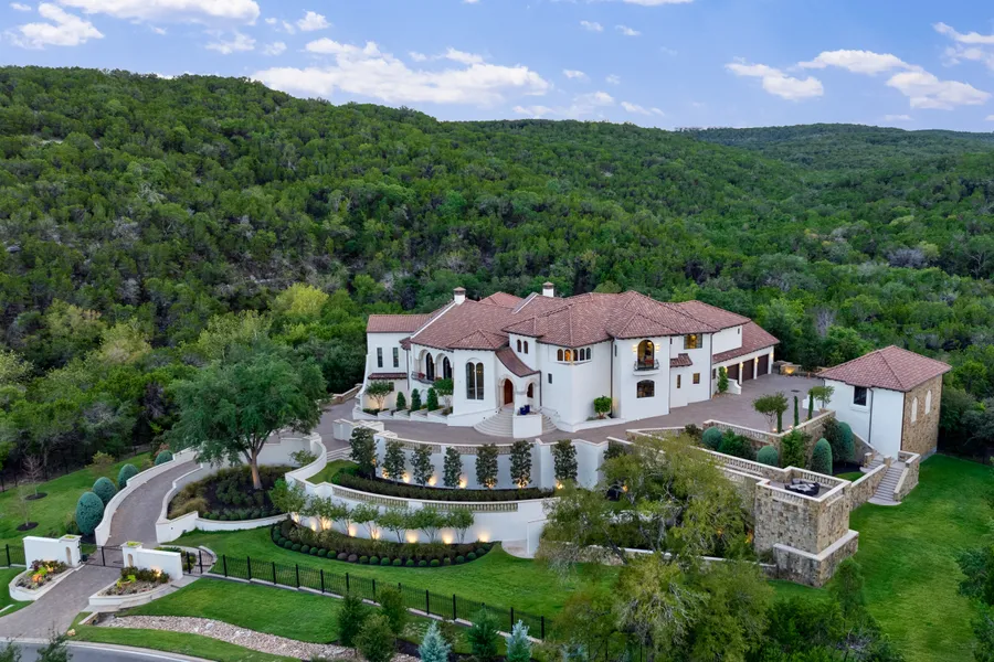 Located just 15 minutes from downtown Austin and under 20 minutes from the airport, the home is also minutes from Barton Creek Country Club, known for its world-class golf, tennis, and wellness amenities. A gated entrance leads to a long, winding drive that opens to manicured grounds and an architecturally striking façade finished in hand-applied LaHabra stucco—a premium exterior treatment that elevates the home’s aesthetic and speaks to the uncompromising quality fou...