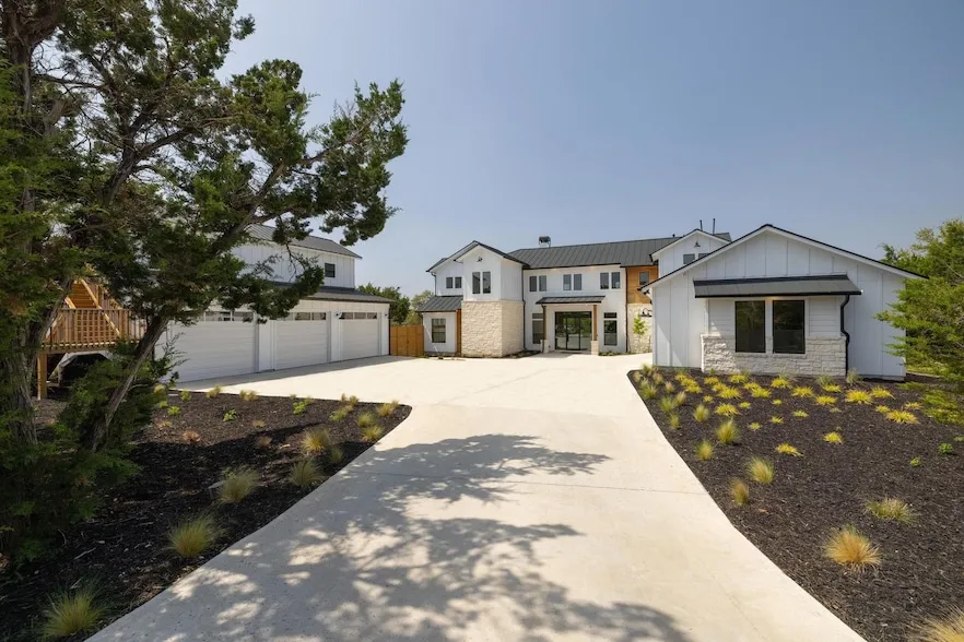 Welcome to your exclusive Hill Country retreat perched atop Flint Rock Peak, one of Travis County's highest points. This stunning estate offers sweeping views of rolling hills and is perfectly situated at the end of a peaceful cul-de-sac in unincorporated Travis County, where you can enjoy lower taxes, flexible building rules, and no HOA restrictions! Covering nearly two acres, this luxurious property includes a 4,823 sq. ft. main residence featuring 5 bedrooms and 4.5 baths. You'll also find a 720 sq. ft. detached in-law suite and a 750 sq. ft. upscale casita, both of which currently generate $82,000 annually as short-term rentals. Plus, there's a versatile 1,575 sq. ft. 3-bay shop that's perfect for a gym, studio, or boat storage. The expansive, flat backyard is ready for your dream pool or outdoor oasis, with hook-ups already in place. Enjoy incredible sunsets from the west-facing porch. Inside, the home combines modern-rustic charm with an open floor plan, vaulted ceilings, large exposed beams, and abundant natural light through massive windows. The stunning kitchen will channel your inner chef with a 48 Wolf range, Viking appliances, a walk-in pantry, an oversized island with bar seating, quartz countertops, and a temperature-controlled wine room. Wellness amenities abound, including a custom cedar sauna, a cold plunge/hot tub combo, and an outdoor shower. Located just minutes from Lakeway and less than 10 minutes from Bee Cave Galleria, this retreat offers easy access to major highways 620 & 71, making downtown Austin less than a half-hour drive away. Experience the ideal blend of peace and convenience in this stunning Hill Country compound. Whether you're looking for a lucrative investment or dreaming of your perfect home, this Hill Country estate is just what you need to make it happen!