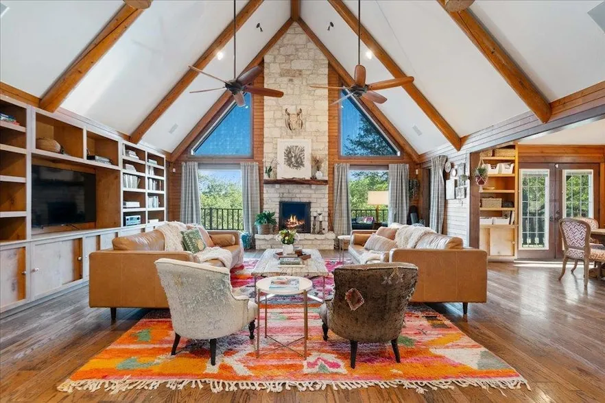 Welcome to Texas Hill Country living! No HOA, city taxes, or MUD! This 3-bedroom, 2.5-bath log home with the green metal roof sits on nearly 8 oak-filled acres with winding trails. It features a custom stone gated entry and is completely fenced for added privacy. From the wrap-around porch, step inside to find a sunlit, open-concept living room with a vaulted beamed ceiling, stone fireplace, and built-in bookshelves. The spacious kitchen flows into the dining area and out to a large deck overlooking the property, perfect for welcoming the day or enjoying the stars at night. The first-floor primary suite includes a bathroom with his-and-her closets, a clawfoot soaking tub, separate shower, and another set of French doors leading to the deck and garden views. Upstairs you'll find two spacious bedrooms at each end of an open hallway overlooking the living room, and an enclosed loft with vintage windows - the perfect office or art studio space. Back downstairs, a large laundry room with sink and extra storage makes a great mudroom after gardening or hiking through the woods. Outside, the rolling terrain makes the property feel even larger than it is, offering space to add on and still enjoy roaming the back woods. The huge barn features enormous sliding doors, a separate enclosed and air-conditioned office or studio, and lots of extra storage space. So many possibilities! Whether you want to utilize the existing animal structures and garden and start your own dream farm, or use the space to create a dream resort-style pool and cabana, this property is just waiting to be your private escape. Perfect for full time living, private retreat, or short term rental. Although it feels miles away from anything, you re actually just 5 minutes from Lago Vista, 20 minutes from Cedar Park, and 40 minutes from downtown Austin. Access to Lake Travis is right in Jonestown.