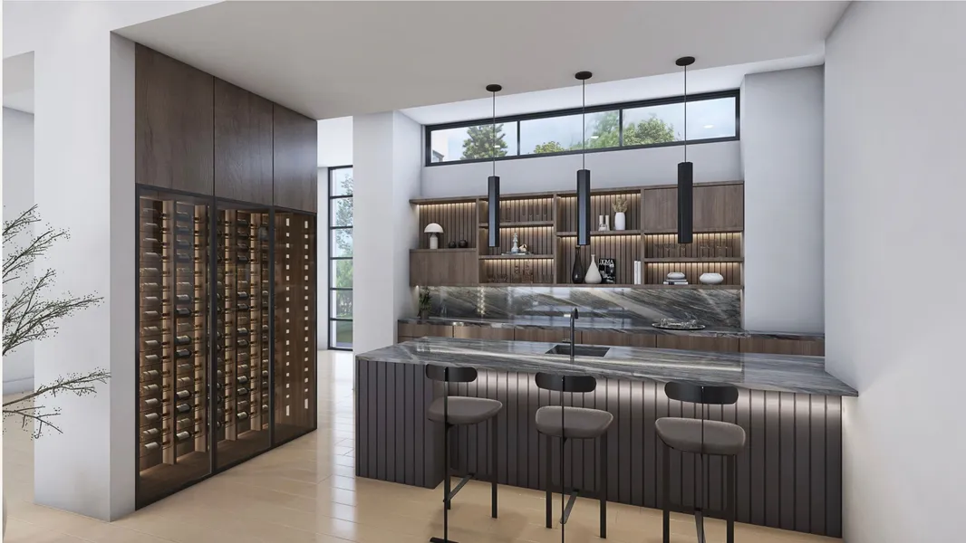 Thoughtfully designed for both lavish entertaining and everyday comfort, the living areas transition seamlessly from sun-drenched interiors to expansive outdoor spaces, creating a harmonious connection between home and nature. The interiors showcase a rich material palette: wide-plank oak floors, white oak ceilings, steel-framed windows, and lime-washed walls offer a timeless yet contemporary aesthetic. Marble-accented cabinetry, artisan tile work, and meticulously crafted wood details underscore the home’s commitment to quality. The dramatic great room, anchored by a sculptural Breccia Azul marble fireplace, opens to a resort-style pool and terrace. A formal dining room is complemented by a custom bar and wine cellar, —ideal for hosting family and friends.