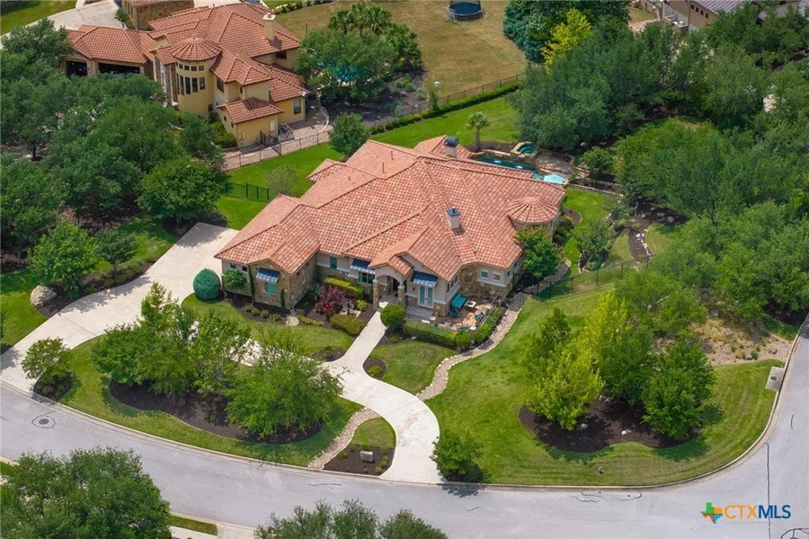 Welcome to your Oasis! Beautiful custom 1-story, 4 bedroom + STUDY (game room can be used as a 4th bedroom or media room) 3.5 bath, home is nestled in the exclusive gated community, The Bluffs, at Steiner Ranch. This elegant home on 1.05 acres, has lots of trees, view of rolling hills, beautiful pool area and elegant circular driveway. Welcoming double iron doors open to foyer with beautiful barrel ceiling entry, Travertine stone, wood flooring throughout, and lots of windows providing natural light. A large family room with stone fireplace opens to a professional grade kitchen, elegant dining room, beautiful archways, groin ceilings and butler pantry. High, custom painted tray ceilings give an open feeling with large sliding glass doors opening to the, nearly 1,000 sq ft covered back patio overlooking pool, fireplace and outdoor living Austin is known for! Enjoy an outdoor cooking area with built-in grill and seat up bar for eating poolside! The large 17x36 ft pool has 2 waterfalls, bubbler, 2 spray fountains, sun-shelf, hot tub. If entertaining or cooking is your thing, the gourmet kitchen is the heart of the home! It features 18’+ granite counter bar, separate kitchen island, lots of cabinet space, Thermador appliances with 6 burner/griddle range, 3 ovens, warming drawer and microwave, great for gathering and entertaining! For casual times, the kitchen dining has great views, large wine and serving bar area, game room/4th bedroom has patio access. The study has access to the front courtyard! Finally, the elegant owner’s suite. A separate hallway with chandeliers, groin ceilings opens to oversized bath with separate vanities, free standing tub, 18 ft semi-circular shower with 4 shower stations, back sprayer, marble floors, towering dome ceiling with large chandelier and custom closet! Moving to the large bedroom, high custom ceilings, it features a bay window with a beautiful view out to the fully landscaped backyard, plus door leading out to the back patio.