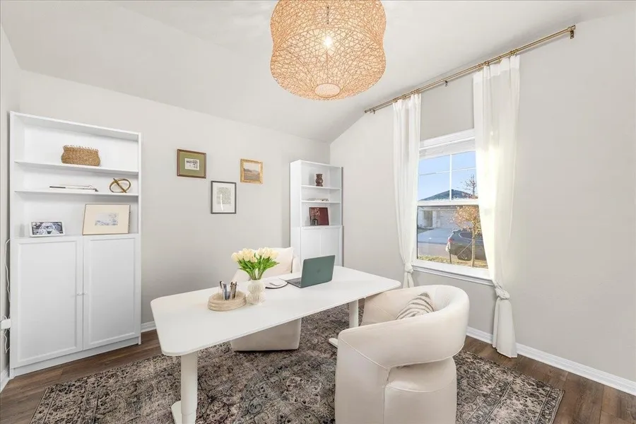 Welcome to 17701 Owl Tree Rd, a beautifully maintained single-story home in the heart of Manor, TX. Set on a well-groomed lot with no back neighbors, this property offers privacy, modern finishes, and a bright, open layout designed for effortless living. Inside, you'll find high ceilings, luxury vinyl plank flooring, and abundant natural light enhanced by warm recessed lighting. The spacious living room includes a ceiling fan and direct access to the fully fenced backyard, creating an easy flow for entertaining. Outdoors, enjoy a large covered patio with plenty of room for grilling, relaxing, or outdoor dining. The airy kitchen opens to the sun-filled dining area and features a generous center island with breakfast bar seating, stainless steel appliances, a pantry, and a stylish full backsplash-perfect for everyday cooking and hosting. A dedicated home office sits off the entryway and includes French doors and elegant lighting, providing a quiet, functional space for remote work. The private primary suite offers a peaceful retreat with a vaulted ceiling, walk-in closet, and an en-suite bathroom equipped with dual vanities, recessed lighting, and a spacious walk-in shower. Two additional secondary bedrooms also feature high ceilings and walk-in closets, giving guests or family members plenty of storage and comfort. Residents enjoy access to community amenities including a pool, park, playground, and walking trails. Conveniently located near local shops, dining, and major Austin-area employers, this home blends comfort, style, and an ideal Manor location. Secure this home's 5.37% assumable mortgage, save thousands annually, and secure a faster close when you work with Roam. Inquire with the listing agent for more details.