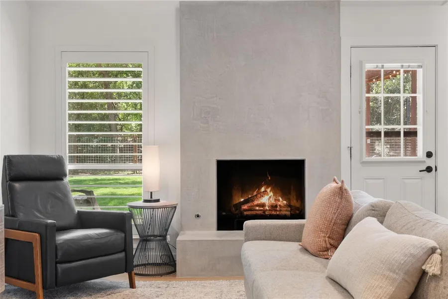 Situated in the heart of South Austin's beloved Cherry Creek neighborhood-celebrated for its mature oak-lined streets, mid-century charm-this single-story home has been exquisitely reimagined to offer an elevated blend of comfort, style, and privacy. Every detail has been thoughtfully curated, from the engineered white oak flooring and upgraded aluminum windows w/wood shutters to the vaulted ceilings & refined designer finishes throughout. The open-concept kitchen stuns w/quartz countertops, a waterfall-edge island, soft-close cabinetry, ample storage, and statement pendant lighting over the peninsula. A defined dining and breakfast area flows effortlessly into the welcoming living room, anchored by a custom stucco fireplace. A built-in sideboard with open shelving in the dining area adds ease and elegance for entertaining. The primary bedroom embraces the home's mid-century roots with i...