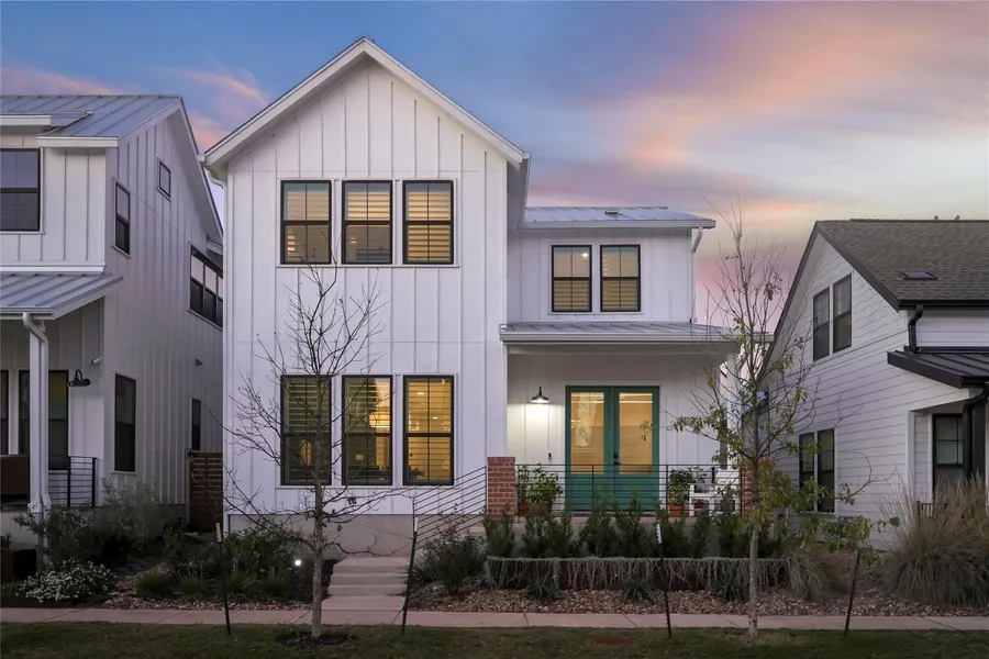 Beautifully designed and meticulously maintained, this modern Mueller home offers refined interiors, exceptional outdoor living, and a flexible floor plan. The light-filled main level features wide-plank white oak wood floors and an open-concept layout, anchored by a stunning kitchen, abundant ceiling-height cabinetry, and a seamless connection to the dining and living areas. A generous walk-in pantry provides rare, well-organized storage, while a secondary living area offers flexibility for a home office, media room, or retreat. Thoughtful upgrades and curated lighting throughout create a timeless aesthetic, enhanced by custom plantation shutters that provide privacy, light control, and energy efficiency, and complemented by the home's durable standing-seam metal roof, providing long-term performance and peace of mind. The primary suite is a true retreat, featuring vaulted ceilings, serene natural light, and direct access to a covered balcony. The spa-inspired primary bath includes a dual vanity, freestanding soaking tub, oversized walk-in shower, and refined finishes. The secondary bedrooms also feature vaulted ceilings, each with access to its own stylish bath. Outdoor living truly sets this home apart. A covered back patio overlooks a beautifully landscaped yard with a herringbone brick patio and a private sauna, an unexpected luxury that feels like a personal retreat. Multiple outdoor spaces, upstairs and down, provide year-round versatility and effortless indoor-outdoor flow. Additional highlights include insulated garage doors, new gutters, tankless water heater, routine maintenance services and a truly move-in-ready package with washer, dryer, smart refrigerator with specialty craft ice, outdoor patio furniture, and the private sauna all conveying with the property. Set in the heart of Mueller, just moments from parks, trails, shops, and dining, this home blends modern design, thoughtful functionality, and an unbeatable central Austin lifestyle.
