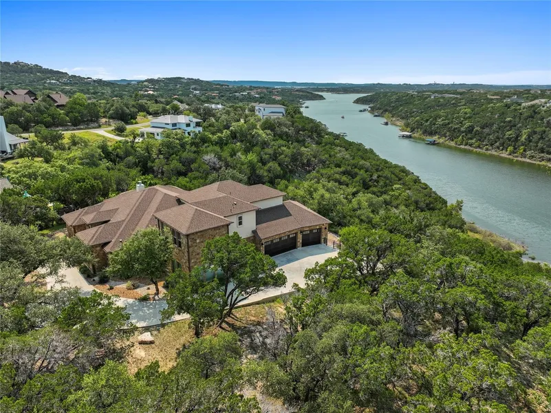 This custom home is located in the Bluffs section of The Hollows and was specifically designed and built for this 2.58 acre lot. The huge covered patio and balcony have picturesque views of Lake Travis. On the first floor you will find 3 bedrooms, 3.5 baths, an exercise room (or flex room) and an open kitchen that is perfect for entertaining with hidden pocket areas for a butlers pantry, coffee bar and very large walk-in pantry. The elegant master suite features dual walk-in closets, a sitting area, a garden tub with fireplace and a spacious mud-set tile shower. Upstairs there is a 2nd living area with 2 beds, a jack/jill style bath and a balcony overlooking the lake. The oversized 3 car garage includes pre-plumbing in the 3rd bay for a possible apartment conversion. A spool type dipping pool is off the patio as well as a fire pit.