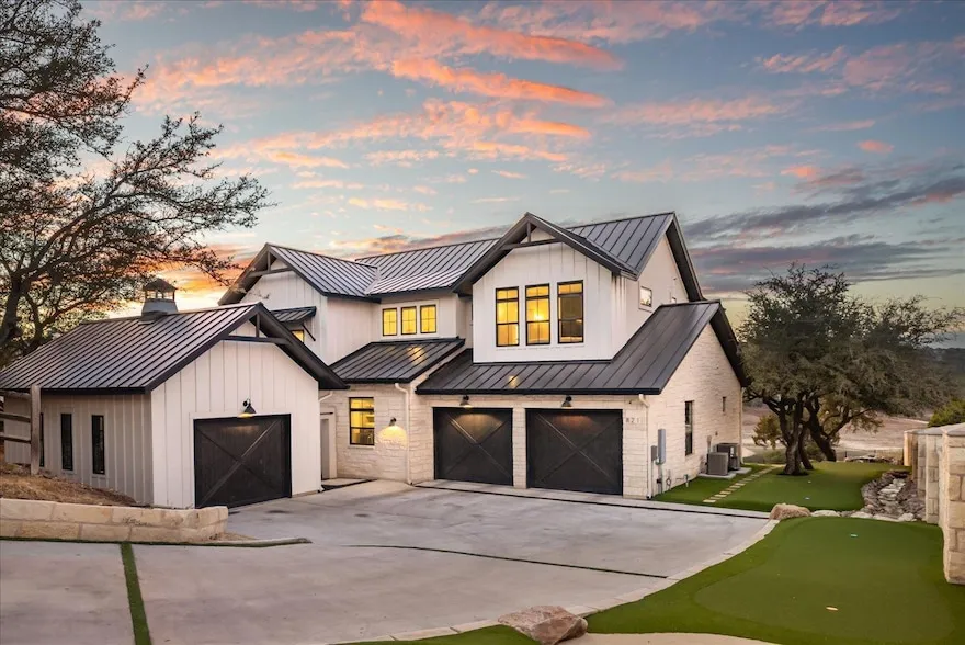Built in 2017, welcome to 821 S. Angel Light Drive, in the gated Angel Bay community in Spicewood, TX a modern farmhouse style home where luxury meets comfort. This stunning 5-bedroom, 5.5-bathroom residence sprawls over 4,259 square feet, offering ample space and a casual and fun vibe. As you step inside, you're greeted by high ceilings and a welcoming fireplace that sets the perfect tone for relaxation. The gourmet kitchen is a chef's dream, equipped with a gas stove, wall oven, stainless steel appliances, and a spacious island with sleek granite counters. A windowed kitchen and built-ins add functionality and flair. Need to work from home? The dedicated office space is ideal for productivity. The main floor primary suite provides an oasis with its own en-suite bathroom. Enjoy movie nights in the media/recreation room. Just outside and adjacent to the patio and pool area are guest quarters with its own kitchenette, bathroom and dining area as well as a Murphy bed. Use this space as a pool house or allow your guests the ultimate vacation! Outdoors, the patio, fireplace and barbecue area promise memorable gatherings, while the backyard offers room to roam. Fun features are a sandy beach area and a pitch and putt golf feature with waterfall and water features. Discover a lifestyle of ease and elegance at this exceptional property.