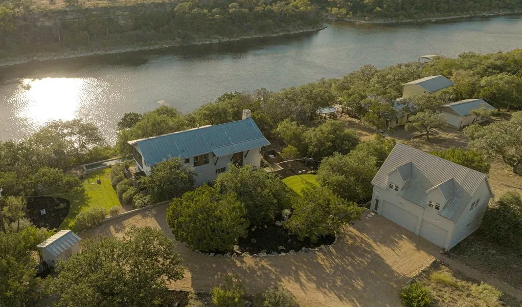 Waterfront Property. Experience Hill Country living in this stunning 4.4 Acre gated modern home on the Pedernales River. Picturesque Hill Country and Water views. 2 Slip covered Boat dock with storage. Priced well under TCAD Value. Main house 3,136 SF and Guest House 604 SF for total of 3,740 SF. Landscaped walkway to entrance provides a prelude to the updated and remodeled design throughout this home. Spectacular spacious living areas with high ceilings, striking chandeliers and walls of windows provide abundant natural light. Sliding glass doors offer seamless indoor-outdoor living ideal for entertaining. Crisp and polished interior blends sophistication with casual elegance. Living area has a wall of low profile built-ins with an integrated wine refrigerator and storage. The fireplace creates a warm and inviting ambiance for cool evenings. Chef inspired kitchen is equipped with a Viking range with propane cooktop and a stainless exhaust hood. Spacious breakfast bar with seating. Sliding barn doors open to a discreet kitchen area with dishwasher, sink, refrigerator, washer/dryer and storage. Large dining room with a wall of sliding doors ideal for family gatherings. Primary bedroom on the main level has access to the back deck for enjoying Pool, Canyon and River views. Elegant spa-like primary bath with soaking tub and beautifully tiled shower. Bunk room upstairs with beamed ceiling great for children or overnight guests. 2 bedrooms plus office/study area with 2 full baths upstairs. Enjoy a blend of rustic Hill Country charm and scenic Waterfront Views from the comfort of 2 screened porches and spacious deck. Convenient outdoor shower off deck. Relax by the firepit while finding serenity as the sun sets. Detached Guest quarters with separate entrance and full bath ideal for overnight guests or extended family. This breathtaking property is the epitome of Hill Country living at its finest. Lake Travis ISD