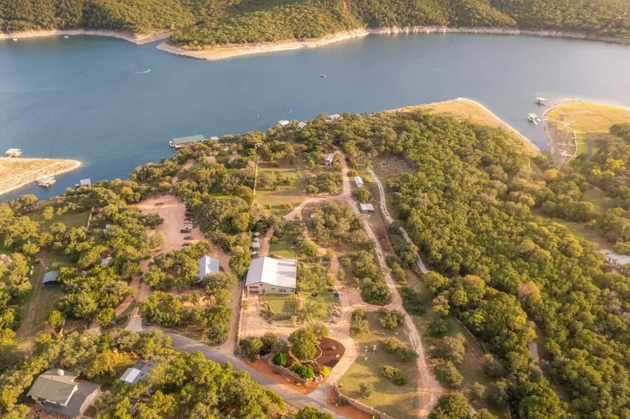 The custom 4,357 sq ft Texas-style barndominium welcomes you onto the property and offers 1,800+ sq ft of living space (2 beds, 3 bath) with an office and flex room that overlooks the air-conditioned barn. The guest cabin (1 bed, 1 bath) offers a cozy living area, full kitchen, and stackable washer and dryer space. The grounds have been cleared of cedar with attractive fruit, pecan, and oak trees sprawling throughout. There are two separate wells and two 10k gallon rainwater collections tanks with an up-to-date UV filtration and purification system. Other notable features include two plug-ins for full RV hooks ups and four irrigation stations that pull directly from the lake. The barndominium is connected to a propane-powered backup generator with two 500 gallon propane tanks buried close by.