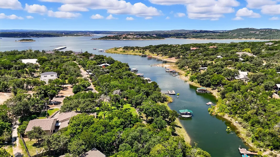 Tucked away in the quiet and secluded Village of Volente, this unique lake house offers the perfect blend of privacy and convenience just 10 minutes to HEB, restaurants, and major retailers, and 35 minutes to downtown Austin. Situated on a sprawling .7 acre lot shaded by mature Texas Oaks, this fully updated 2 bed, 2 bath home (built in 1964) features 2,261 sq ft of indoor living plus 1,600 sq ft of outdoor living space with a wraparound deck and a 5-car garage. The property sits on a flat grassy lot and offers direct waterfront access, complete with a stone stairway leading to a covered boat dock with concrete decking, lighting, power, and a hydro-hoist lift. An additional TREX composite swim/toy dock enhances your lakeside experience. Inside, enjoy slate and bamboo flooring, limestone fireplace, gigantic picture windows in every room and a fully renovated kitchen with a breakfast bar, double oven, wine fridge, and backlit bar. The oversized primary suite boasts a fireplace, 190 sq ft custom closet, and a flagstone bathroom with a jacuzzi tub and separate shower. A retractable glass door connects indoor and outdoor living, opening to a tiki bar, dining area, fire pit, and 220v outlet for a hot tub. A 5-car garage includes a climate-controlled office and gym, with a second-floor storage area and potential apartment. There is space for a pool, ADU or casita on the lot. No HOA. Other highlights include a fenced backyard with a covered patio, shed, vegetable garden, RV slab with separate septic and 50amp outlet and is within walking distance to Balcones Canyonlands National Wildlife Reserve and a waterpark with a restaurant and ziplines. Feeds into top-rated Leander ISD schools, including Vandegrift HS. Recent updates: new roof, HVAC, garage doors (2023), refrigerator (2024), and exterior paint (2025).