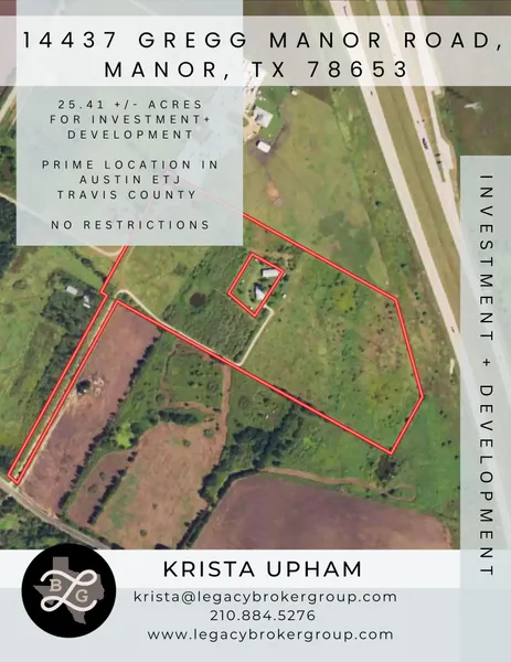 14437 Gregg Manor Road is a prime development tract located near Cameron Road and 130 on the East Side of the Austin ETJ. Visibility from 130 and the nearby expansion of Cameron Road and Wells Branch Parkway create a prime location for multifamily or industrial development. Area highlights include many large employers such as Amazon, Samsung Semiconductor, BAE, 3M, Infosys, Home Depot Tech Center, Dell, General Motors Innovation Center, Capital Beverages, Natera,Applied Materials, etc. Also, there are many residential developments nearby such asBellingham Meadows, Cantarra, Fossil Creek, Wildhorse Ranch, Shadow Glen, etc.