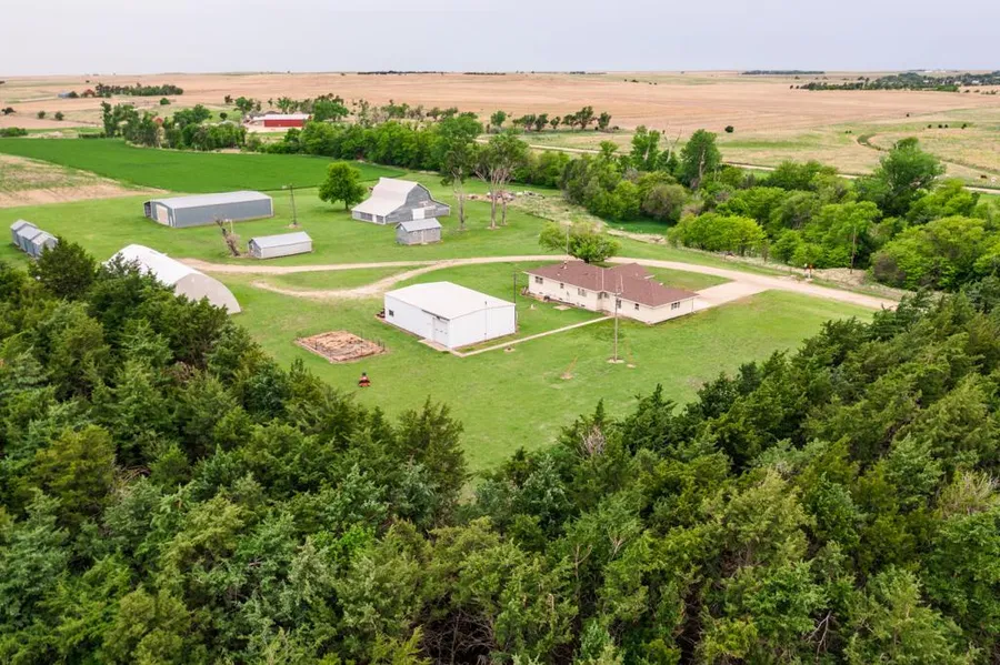 The property itself is beautiful. 2 all-season roads create an intersection at the northwest corner of the property, and a long driveway leads back to the 8 +/- acre farmstead. An expansive shelter belt sweeps around the outside of the farmstead, giving you great protection from the Kansas winds. Big Creek borders the entire length of the property on the west side, providing beautiful year-round views and lots of privacy. Be prepared to stop for the deer and turkeys, as they regularly travel through the farmstead.