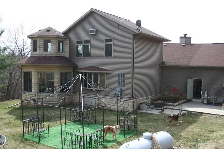 The basement has 2 BR with stone floor, infloor heat, closets, 3/4 BA, ceramic tile rec. room that is 27x20. There is a utility room with an LP boiler with infloor w/FA furnace, AC, 200 amp breaker service + 100 amp extra with washer/dryer laundry room. There is a 10x16 all season porch, cement patio, whirlpool hot tub outside. There is vinyl siding; stone trim (Biesanz stone). There is a nice back yard.