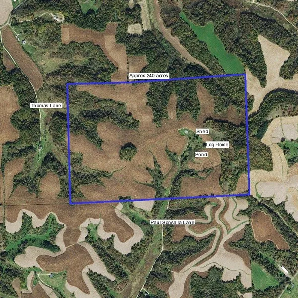 240 acres per Trempealeau County tax role consisting of approx. 117 acres tillable and the rest hardwoods. Property is located at the end of a dead-end town road that is very secluded. A 60 x 60 pole shed, chicken coop and a vintage log cabin built around 1850 are situated at the end of Paul Sonsalla Lane on top of the bluff with a 360 panoramic view. A spring fed pond is located directly below the buildings. Electricity and two wells on property. Property is completely fenced. No government programs or current cropland lease. Land has been studied for sand mining with some great potential. Great deer and turkey hunting. Very solid investment property. Borderlines and acreages are approximate.