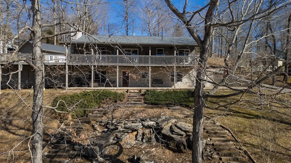 Beautifully designed waterfront home offers the perfect blend of comfort and rustic design. Covered front porch welcomes you into a gorgeous entryway with beautiful hardwood floor that flow throughout the main and lower level. Family room features stunning stone fireplace and numerous windows that showcase the water view. Primary bedroom and bath with additional bedroom and bath on main level. Kitchen has pantry and breakfast area. Deck extends across back of home. Downstairs, the walkout basement features another fireplace, gaming area, two bedrooms, kitchen and bath. Equipment room/ workshop. Concrete patio and hot tub. Concrete sidewalks on both side of home lead to covered dock with two slips and additional dock. Two car garage. Garage floor has had epoxy applied to floor and is immaculate.