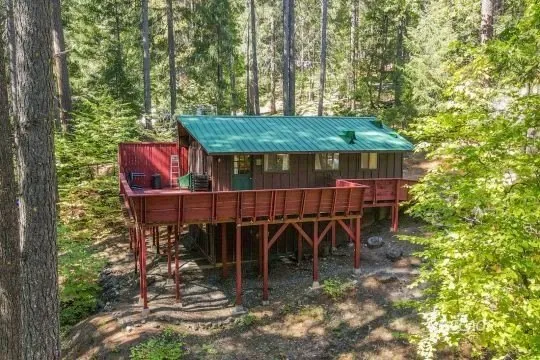 Nestled at the foot of the stunning Trinity Alps Wilderness, this charming 980 sq. ft. cabin captures the essence of mountain living and lakeside relaxation. Featuring beautiful T & G hemlock wood and vaulted ceilings, this inviting retreat offers a warm, rustic atmosphere throughout. The main level features a cozy one-bedroom, one-bath layout, with the kitchen conveniently centered in the heart of the home-perfect for easy gatherings, great natural light that enhances the cabin's serene charm. Downstairs, a walkout basement provides additional sleeping space with two large beds, ideal for guests or family getaways. Step outside to enjoy the expansive wraparound deck-perfect for relaxing, entertaining, or taking in the forested scenery. Built with quality in mind, the cabin features redwood board-and-batten siding, a durable metal roof, and ample decking. Sitting on .43 of an acre, there...