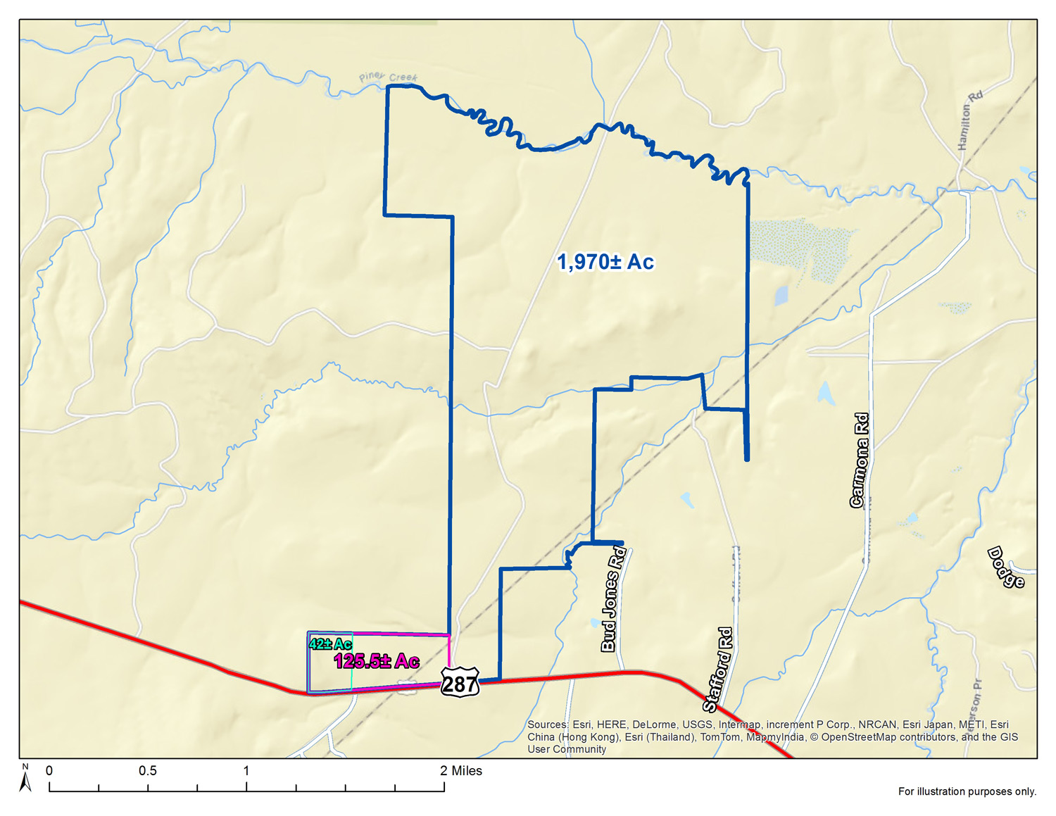 FORESTRY RECREATION. HUGE TOPOGRAPHY WITH HILLTOPS. BIG TRACT BORDERS "PINEY CREEK." WOODED WITH MERCHANTABLE PINE & HARD WOOD. CHOOSE YOUR SIZE ON SMALLER TRACT FRONTING US 287.