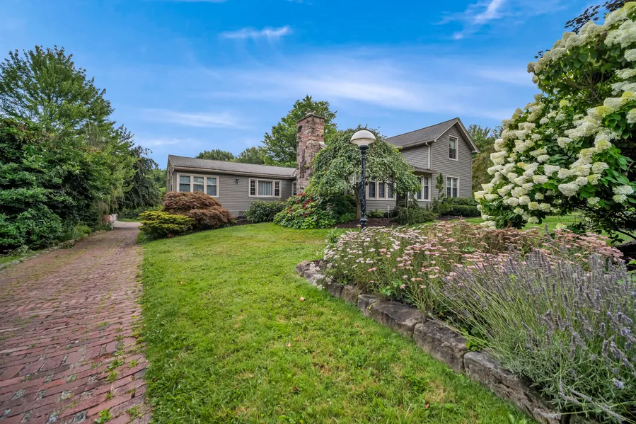 Spread across 2.5 acres of verdant trees and manicured landscaping, this stunning Hubbard home offers both privacy and quick access to wonderful school system, golf courses and restaurants! The property is adorned with intricate custom stonework and features a unique two-car detached garage with a turret. As you enter via the paved turnaround drive or the brick drive, you are greeted by the garden brick patio that leads up pillared brick stairs. Enter through magnificent French doors into a vestibule with pretty tile flooring, and pass through another set of French doors with custom stained glass. A renovated kitchen features hardwood floors, black appliances, ornate millwork with rosettes, scenic views, and a pantry with double stained glass doors. French doors open to the sophisticated dining area, which showcases a beautifully crafted wooden ceiling. The adjacent living room exudes warmth and charm with its inviting atmosphere, a finely crafted wood-burning fireplace, and inset ceiling lighting. The first floor also offers a secondary entertainment space surrounded by crown molding and privacy French doors, situated next to the master bedroom suite. This suite includes a luxurious private bath with a glass-door tiled shower. Additionally, the first floor houses a laundry room with a beautiful stained glass door, a guest bedroom, and a second full bathroom featuring a Victorian-style console sink and tub. The second level features a third bedroom with built in features and office/storage space. Warm weather will be enjoyed in the outdoor entertainment area with covered pavilion, fieldstone wood-burning fireplace, knotty pine vaulted ceiling, and an all-brick patio. The landscaping in yard is well-planned and offers unique plantings with plenty of color! Current owner has made many nice updates to the home including the addition of a black metal fence surrounding the immediate yard area. A true gem! Schedule a showing today!