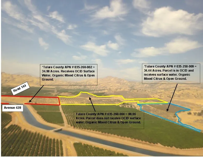 For Sale; 158.38 Acres Mixed Organic Citrus and Open Ground. Three Tulare County APN Parcels; #s 035-260-002 (34.98 Acres/Parcel is in OCID), 035-260-004 (88.96 Acres/Does not receive OCID water), & 035-250-009(34.44 Acres Parcel is in OCID). Multiple pumps, wells, and OCID surface water on the 34.98 acre parcel(035-260-002). The 88.96 acre parcel does not receives district surface water and has one well(035-260-004). The 34.44 acre parcel does receive OCID surface water (035-250-009). Additionally for the water situation, the sale also includes two noncontiguous offsite well sites that aren't currently operating(Offsite well APN #s 035-250-014 & 035-250-015). Parcel 035-260-002 (34.98 acres) will not be sold individually (parcel with multiple water sources). Zoning = AE20 (Agriculture). All offers are subject to approval of the bankruptcy court.