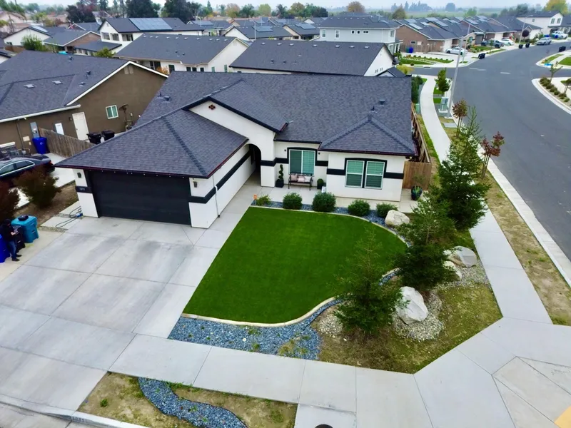 Welcome to this stunning, move-in-ready home located on a desirable corner lot in a well-kept neighborhood. This modern single-story residence offers excellent curb appeal with a sleek exterior, manicured landscaping, and a spacious driveway leading to a two-car garage. Inside, you'll find a bright and open floor plan featuring vaulted ceilings, and recessed lighting,. The contemporary kitchen is the heart of the home, showcasing white cabinetry, granite countertops, a large center island with seating, stainless steel appliances, and ample storage perfect for entertaining or everyday living. The open-concept layout flows seamlessly into the dining and living spaces, creating a warm and inviting atmosphere. Large windows provide abundant natural light, while the neutral color palette allows for easy personalization. The exterior offers low-maintenance landscaping and privacy fencing, ideal for relaxing or hosting gatherings. Conveniently located near schools, parks, and local amenities, this home combines modern comfort with everyday practicality