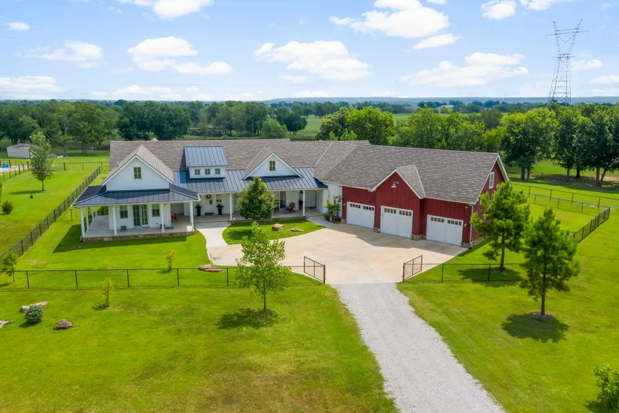 Total Perfection! Modern Farmhouse on 78 acres. Custom built luxury ranch. Open concept with large rooms, soaring ceilings, great natural light and fabulous views. Kitchen includes an over sized custom island, walk in pantry and farm sink that overlooks the pond and pasture. Luxury Master Suite with spa bath and a dream closet that includes a second laundry and safe room. The office opens to the front porch and can also be used as a 4th bedroom. The spacious great room has a fantastic view of the outdoors and boasts a cathedral ceiling. Laundry room includes a built in dog spa. Second living or media room upstairs. Custom stable with 11 stalls, 2 groom areas, wash bay, tack room and living quarters. Additional building for car or equipment storage. Pipe fenced, income producing hay fields. Perfect for equestrians and ranchers.