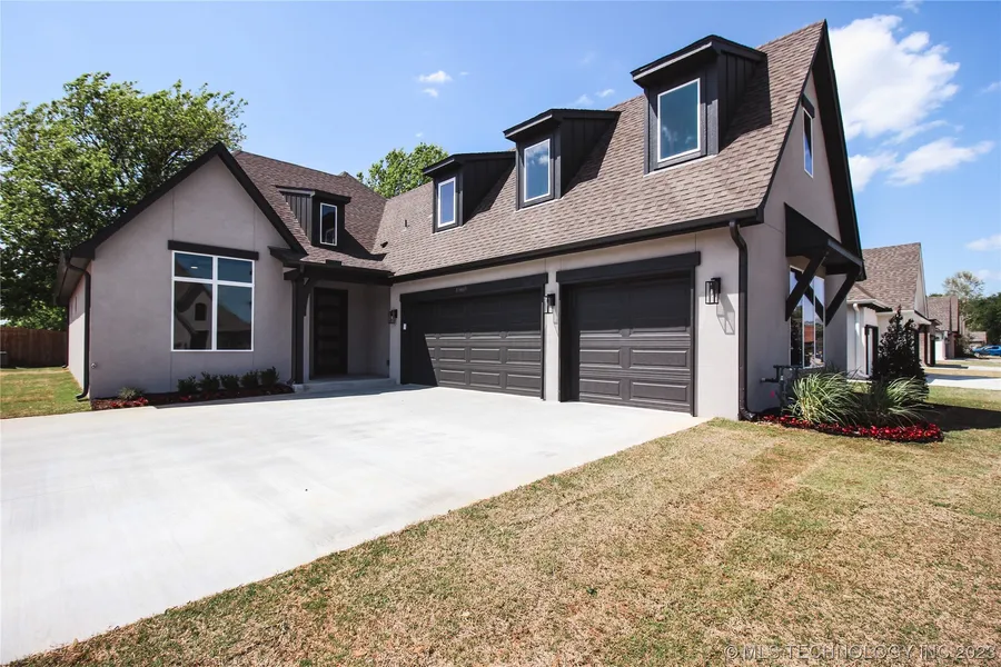 Stylish modern farmhouse design on Villa style lot w/ spacious great room and vaulted ceilings throughout. Living w/ gas log fireplace, built in bar and beamed ceilings. Dining area combined w/ living. Kitchen has large quartz island, walk-in pantry, built-in oven and microwave, gas cooktop and 3 large windows above sink. Master suite w/ vaulted & beamed ceiling, walk-in closet, double sinks, soaking tub & separate shower. Addt'l bed down w/ private full bath. Half bath down plus vaulted & beamed office w/ closet. Upstairs has 2 beds, 1 bath and a large game room w/ floored attic space. Stucco exterior, dormer windows, covered porch & patio and 3 car garage. Sits across from neighborhood playground and pond. Gated access w/ great location!