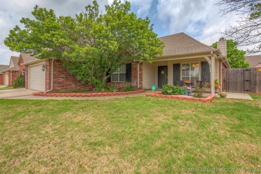 WELCOME HOME: one owner, well maintained home is located in the desirable Churchill Park & Jenks West Schools. Beautiful curb appeal, established landscaping, covered front porch welcomes you into this open floor plan, living room with a brick fireplace, large kitchen, a large nook, pantry and abundance of counter space. Large primary suite/ bath with double sinks, separate shower, tub and his and her closets, Off the kitchen awaits your outdoor living space made to relax or entertain on the large covered patio. UPDATES include: New roof in 2020, New A/C 2018, exterior paint 2020, engineered hardwood floors in living room and hallways, concrete extended on driveway, outside back patio and sidewalk along side of the house in 2019. Easy access to Hwy 75, Creek Turnpike, Tulsa Hills for all your shopping, dining needs, grocery stores & minutes to the Ten District in Historic Jenks, OK