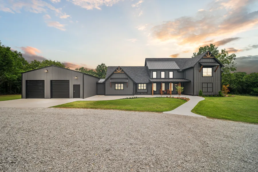 Welcome to country living at its finest! Be instantly amazed when you pull into the drive of this commercial builder's custom home on a picturesque 11 acres! Fall in love with the peaceful and tranquil setting of this newer construction, modern farmhouse home and surrounding acreage. The home is reinforced with a post-tension slab, 30 year architectural shingles and standing seam metal roof, 6" frame studs, attic spray foam insulation and 8' glass storm front door. The vaulted ceilings in the large kitchen living room combo make a perfect space for family and entertaining. Take note of the custom made heavy wood barn doors throughout the home and an interior 9x14 storm shelter or gun safe room. Large butler's pantry off of the kitchen with floor to ceiling storage and spacious prep area. Upstairs bedroom is laid out for a bedroom and gameroom combo, perfect for children or a guest suite....