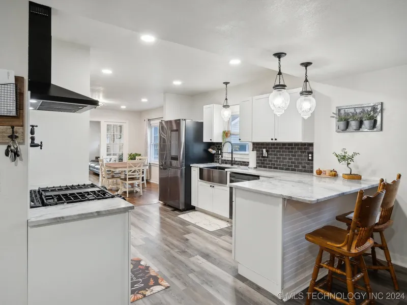 Great kitchen where funtionality meets style marble countertops, new cabinets, stainless steel appliances, wine fridge, farm sink, designer tile backsplash,