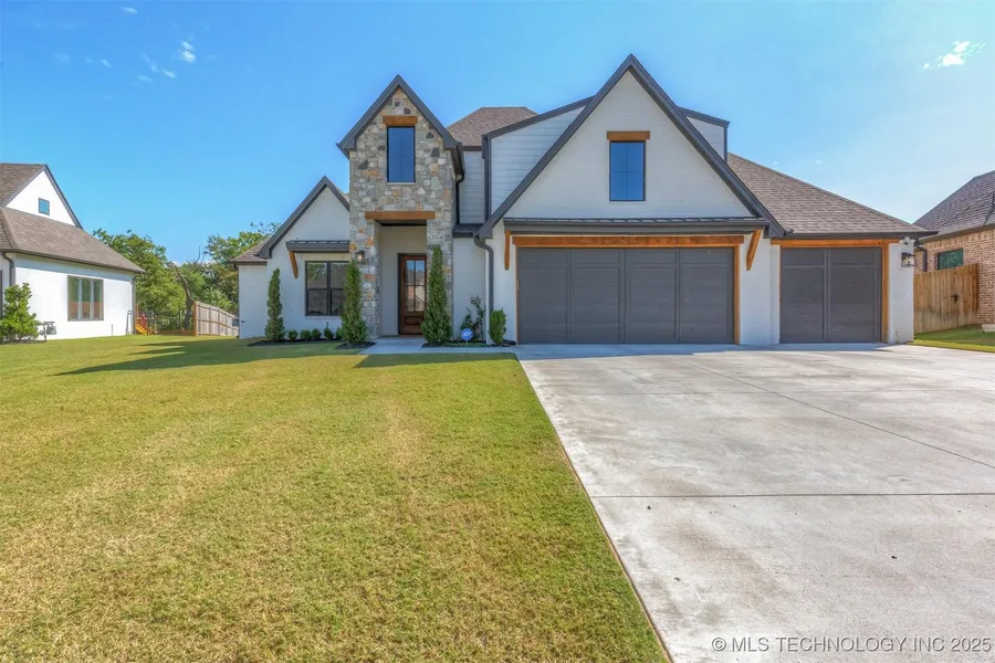 Stunning custom-built home in a premier Jenks gated community! Built in 2023, this home stands out from new construction with extensive upgrades and high-end finishes that add both style and functionality. This 4-bedroom, 3.5-bathroom home with a 3-car garage features a thoughtfully designed layout with soaring ceilings, designer fixtures, custom hardware throughout, and premium details. Step inside to a two-story entry leading to an expansive open-concept living space. The gourmet kitchen boasts an oversized island, premium appliances, a 5-burner gas range, a butlers pantry, and elegant finishes. A floor-to-ceiling brick fireplace serves as a breathtaking focal point in the living room. The primary suite offers an expansive walk-in closet, instant hot water in the master bath, and direct access to a mudroom and utility room. Additional highlights include a dedicated office with exposed ...