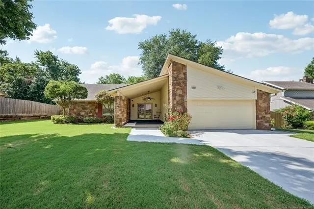Clean inviting home with large covered front porch & professional landscaping. 3 bedroom 2 bath home has vaulted ceiling ready for entertaining! The living room/dining combo includes Square Panel Traditional Wainscoting giving that traditional/modern touch. All new lighting fixtures & recessed lighting, wet bar/coffee bar, additional room that can be used as office/4th bedroom. New laminate floors, new fresh neutral paint, updated kitchen with ss appliances. Also has newer air unit and storage building. Park and community pool! All shopping and restaurants close by & Creek turnpike access.