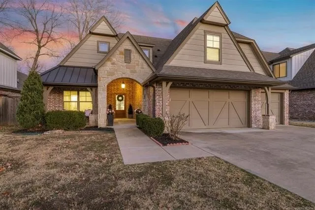Discover luxury living in this beautiful home located in Somerset, one of Bixby's most sought-after gated communities near Bixby North Elementary. From the moment you approach, the wonderful front porch surrounded by gorgeous stone draws you in! Perfect for rocking chairs and relaxing in the evenings with a glass of tea, watching the passers-by. As soon as you step inside, you'll feel the warmth of rich hardwood floors, wood beamed ceilings and the airy elegance of a spacious open-concept living room, highlighted by a striking stone fireplace and built-ins that anchor the space. The spacious kitchen featuring a huge walk-in pantry, perfect coffee bar, generous counter space, and amazing layout for both everyday living and entertaining. The main-level primary suite offers a peaceful retreat with a spa-style bathroom complete with a soaking tub, walk-in tile shower, and his and hers vanities. The generous primary closet also connects to the laundry room, featuring a folding space, sink and generous storage! A second bedroom on the main floor with en-suite bath and walk-in closet makes an ideal guest room or a designated home office. Upstairs, you'll find a large game room and 2 additional bedrooms, giving everyone their own space to relax and unwind. Coming in from the 3-car garage, a wonderful mudroom and generous coat closet offer ample storage and a place for staying organized. Outside, enjoy evenings on the big covered patio, perfect for grilling, gatherings, or quiet mornings with a cup of coffee. Situated in a quiet neighborhood known for its convenience and charm with sidewalks throughout, this home blends comfort, style, and location! Dream of slow school mornings, backpacks bouncing, hand in hand as you take the dedicated path to school, only a few houses away!