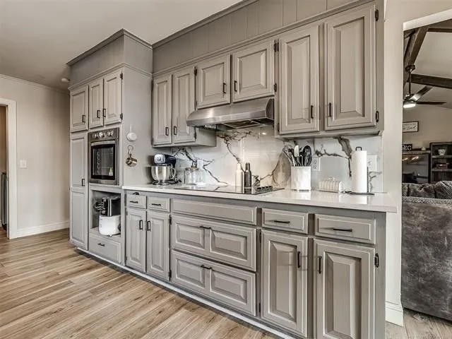 STYLISH UPDATE! Move-in ready one-level home with fantastic, flexible floor plan in an established neighborhood! Spacious living room with vaulted and beamed ceiling, wood burning fireplace with stone surround and wood-look luxury vinyl flooring. Gorgeous, fully remodeled kitchen with tons of cabinets, granite counters, stainless steel appliances opens to a sunny dining area! Roomy formal dining or office. Large primary bedroom with a wall of windows has a beautifully updated ensuite bathroom with new vanity, sizable shower and designer lighting and fixtures! Secondary bedrooms have great closets and proximity to remodeled hall bath with gorgeous tile work and new tub/shower combo. Decked attic. Covered back patio looks like a fully fenced back yard! Quick access to highways. Walk to Longview Lake Estates swimming pool and park!