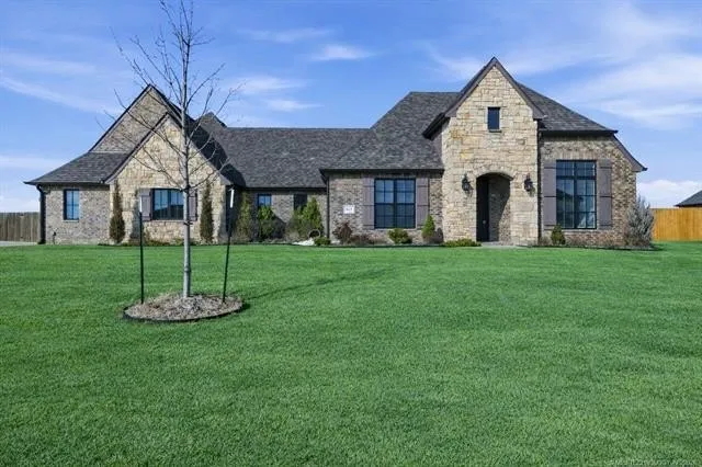 The living room showcases a full wall of tall windows with expansive pasture views and abundant natural light. The 3-car garage includes epoxied floors and a walk-in storm shelter.