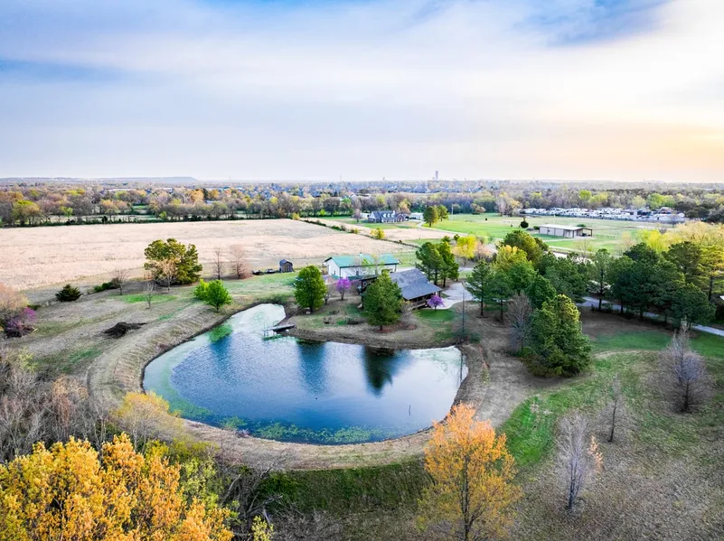 Whispering Pines Country Estate offers a rare opportunity for you to own +/- 40 acres of beautifully maintained land just +/- 15 minutes south of the Tulsa metro area, right between Jenks and Glenpool, off of W 126th St S, just east of the US-75 corridor. This property combines the best of both worlds, quiet country living with easy access to work, entertainment, and all of the urban amenities one’s heart could desire. This property features a charming 2,540 Sq ft, 4-bedroom, 3-full bathroom, custom white cedar log home built in 2003, with a new roof (September 2024). Enter through a stunning wooden door with stained glass and electronic coded access. The open-concept main living area boasts pine finishes, large overhead support beams, and windows in the eaves for letting in natural light. Enjoy a cozy wood fire stove on a stone hearth, and a kitchen with custom knotty pine cabinets, sol...