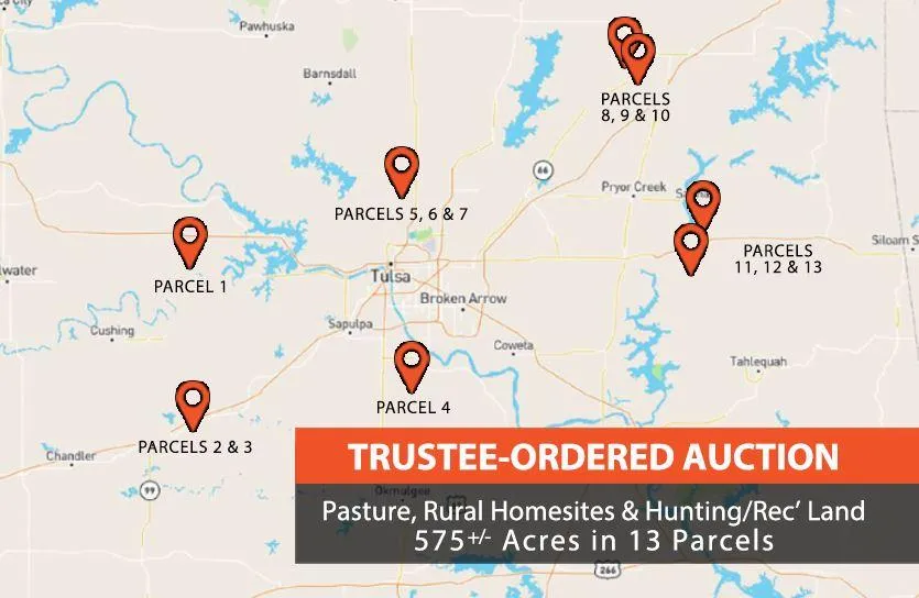 Trustee-ordered auction of 575 acres in 13 parcels ranging from 10 to 80 acres. Parcels located throughout Tulsa, Mayes, Creek and Craig counties.