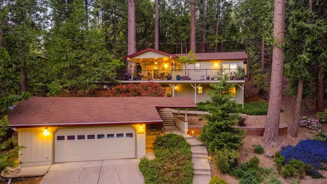 Magical treehouse with fishing in your own backyard! This serene Twain Harte cul-de-sac home has a meadow view in front and the beautiful water way referred to as the Twain Harte Ditch or the Tuolumne Canal, just steps from your back door. The expansive, updated, composite decks under the massive pines and colorful dogwoods give you a tranquil, peaceful feeling. Imagine the amazing summertime entertaining you could do here, with perfect morning sun and afternoon shade. With 3 bedrooms and 3 full baths, this home can comfortably sleep up to 10. The Seller would even entertain including most furniture and furnishings if that’s what’s best for your plans. The great room area is open and updated, and the kitchen has near new (2020) black stainless LG appliances. While guests enjoy the downstairs, you’ll have privacy in your enormous master suite with its very own steam shower. With the...