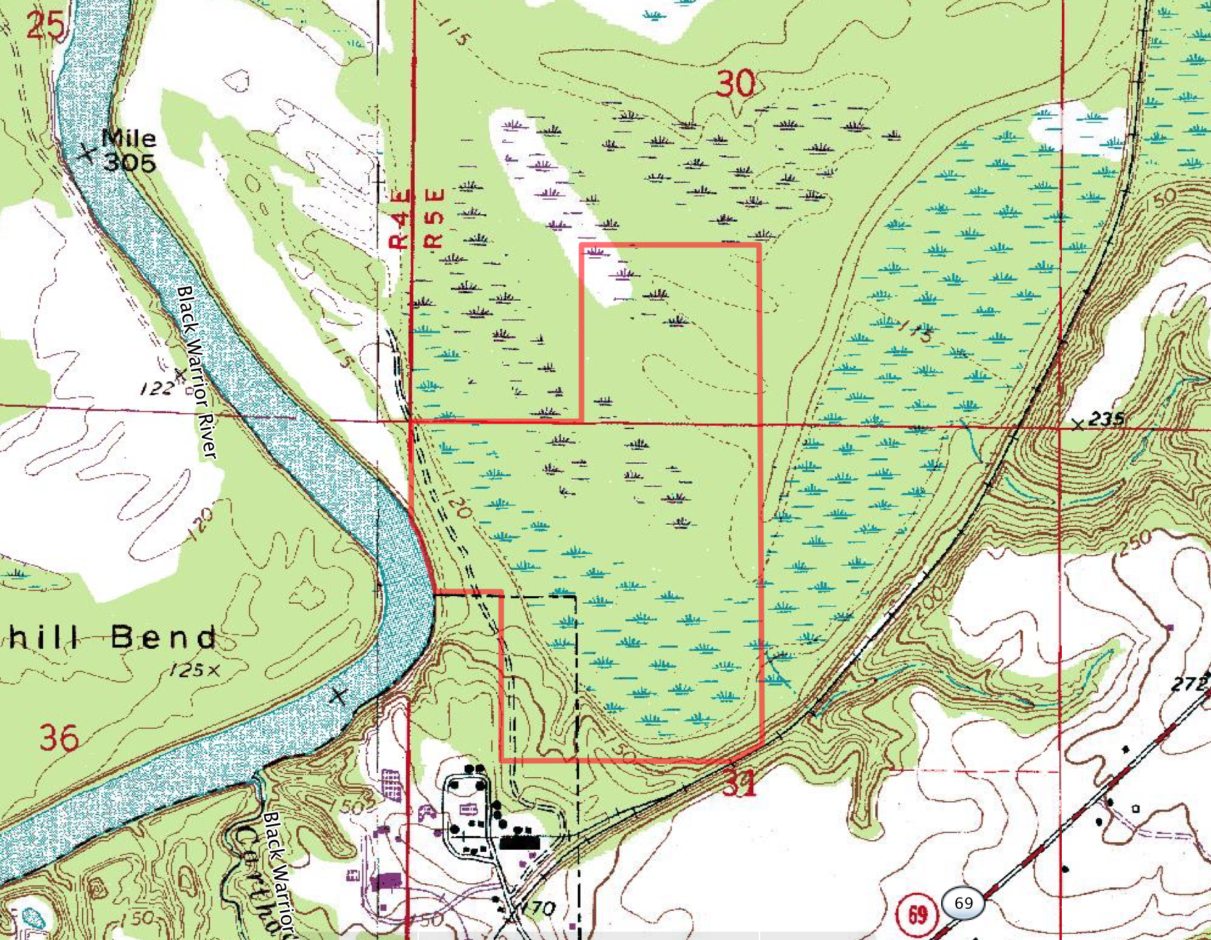 *This unique hunting property features 600 feet of frontage on the Black Warrior River and a broad sandy beach.
