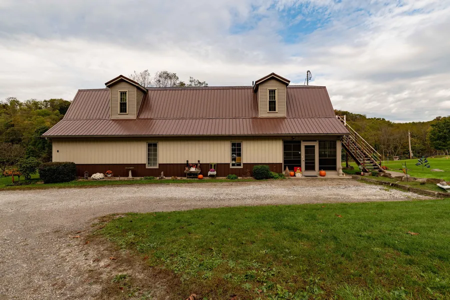 2001 Gambrel 3 bed 2 bath home is situated on 73.31 acres. Includes 23.97 acres of comm. property. Home has been pristinely cared for and well maintained. Spacious kitchen lined with custom cabinetry, two tier island and built in pantry. Open concept throughout. Features a screened in patio, spacious entry way with a custom staircase and a large 23X20 bonus room that could be used as extra living space. Balcony overlooks a gorgeous pond that was inspired and created by the owner. It is fully equipped recreationally and is stocked with bass, blue gill, crappie, amurs and 25 beautiful Koi. Covered boat dock, 12X20 outbuilding, arched bridge leads to island filled with greenery and rustic stone. Back of property is wooded but has many cleared areas for building or other recreational uses.
