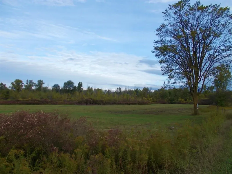 Woods are pretty thick in alot of places. Comprised of mostly poplars, maples, and dead ash. Theres a partial opening up front, about 10 acres worth, that the seller mowed some of this summer. The mowed area is now a glowing green patch of new grass. Good spot for your camp, or food plot. The deer seem to be enjoying that new grass now. The woods are mostly lower ground, mixed with some areas of grass and brush. Its not all underwater, but will be squishy to splashy in quite a few spots depending on the time of year. The very west end of the property does seem to be drier and has a few hardwo...