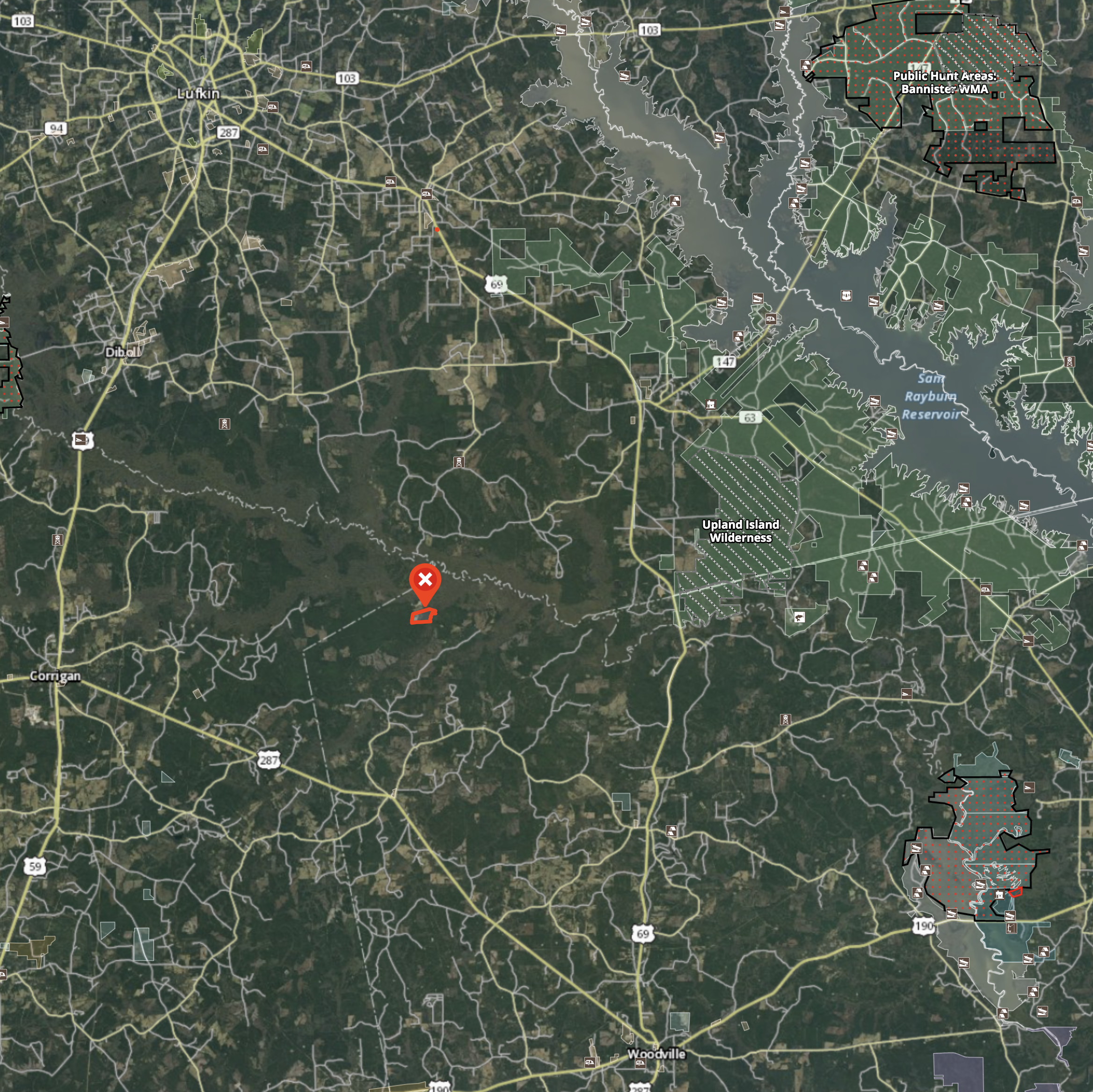 The hunting on this property is second to none. Large groups of deer can easily be spotted in the pastureland section on this property. Wide deer and hog trails are scattered all over the hardwood bottom section along Caney Creek. This Creek is a large, year-round creek. The West boundary is also the renown Carter Pasture Hunting Club; where massive whitetail deer are taken yearly. The abundance of game can be directly attributed to how remote this location is.