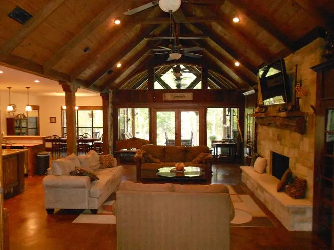 Set on 23 +/- acres this recently constructed three bedroom, two bath custom stone open designed home is highlighted by a beautiful vaulted, timbered great room with adjacent kitchen and dining areas all overlooking a rear covered deck and stocked fishing lake below. Designed with an artist's touch, the stone and siding home on slab has approximately 2,226 square feet and features wood stained doors and trim throughout with stained wood ceilings, beams, and a beautiful cedar mantle over the stone fireplace in the centerpiece great room.
