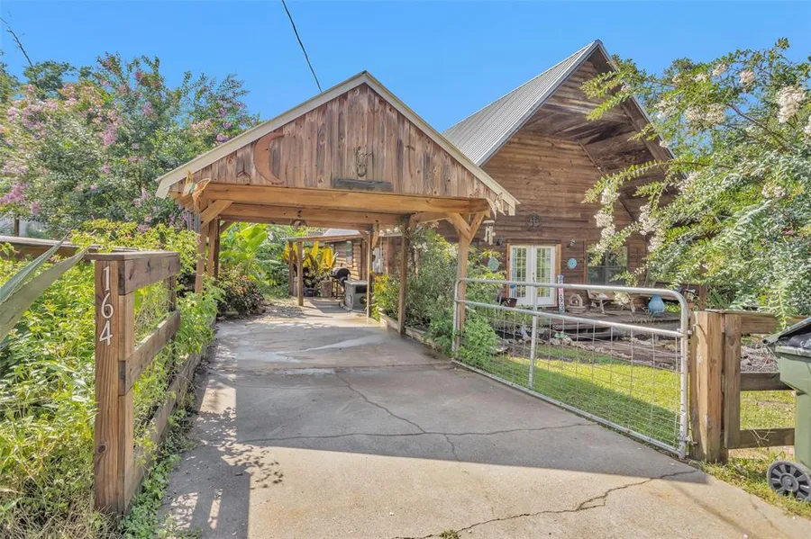 Welcome home! This gated, charming home has 3 bedrooms, 1 bathroom. The lush landscaping provides beautiful curb appeal. Dual carports can house parking for 2 vehicles + 1 vehicle. Home has a whole house generator. The Texas size front porch is just the spot for relaxing or barbecuing. Once inside, the home features high ceilings and an open concept floor plan that is perfect for easy living and entertaining. The center of the family room features a wood burning fireplace. Downstairs there are 2 spacious bedrooms with the 3rd bedroom on the second floor. Out to the side of the home, there is a storage building that stays as well as a workshop. Come check out all this home has to offer!