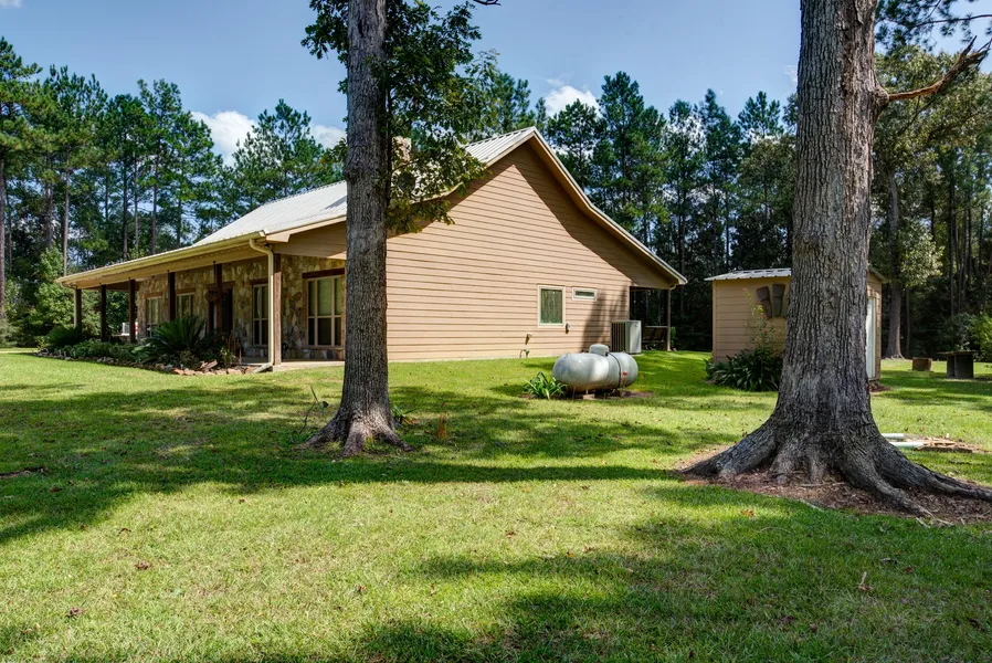 A gorgeous hardwood, glass-lited custom built front entry door and rear patio doors open to front and back covered porches with views of the pretty lawns, large shady hardwood trees, and attractive extensive landscaping. Other improvements include a standalone insulated well-house, metal pole barn for equipment storage, and a large portable storage building. Home is wired for generator. The partially fenced property features dual rocked entry drives, is wooded with mostly larger pines, but has many larger native hardwoods scattered about for shade and privacy.