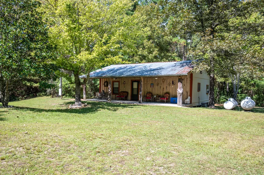 Offering 10+/- heavily wooded secluded acres this ready-to-enjoy nicely improved property features a rustic fully furnished and appointed two bedroom, one bath wood sided home with a beautiful front sitting porch, spacious combined family/dining/kitchen room, indoor utility room, and several useful storage buildings.