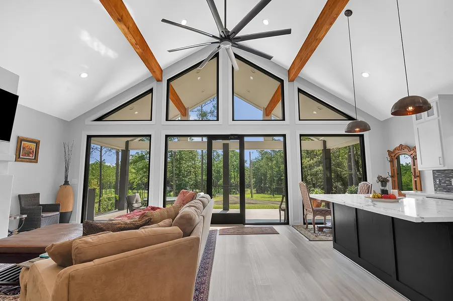 This property is a hunter’s and outdoor enthusiast dream. Sitting high on a hill, the custom home overlooks ±192 acres of prime hunting land loaded with deer, hogs, turkey and wildlife. The land features cut trails, rolling hills, wet-weather creeks, mature pines and hardwoods. It’s ready for stands, feeders, ATV riding, and year-round hunting. The home offers a comfortable retreat after a day in the woods, with cathedral beamed ceilings, quartz countertops, a wood-burning fireplace, and a whole-house generator. A Wi-Fi-controlled automatic gate leads up a winding driveway offering complete privacy. The home is protected with wall-to-ceiling spray foam and a heat pump to help with Texas heat and energy costs. The drive-through workshop is perfect for storing gear, side-by-sides, and equipment. Bordered on 3 sides with 1300+ acres of timber tracts, the perfect spot for serious hunters looking for a private retreat with endless potential. Located in Woodville TX.